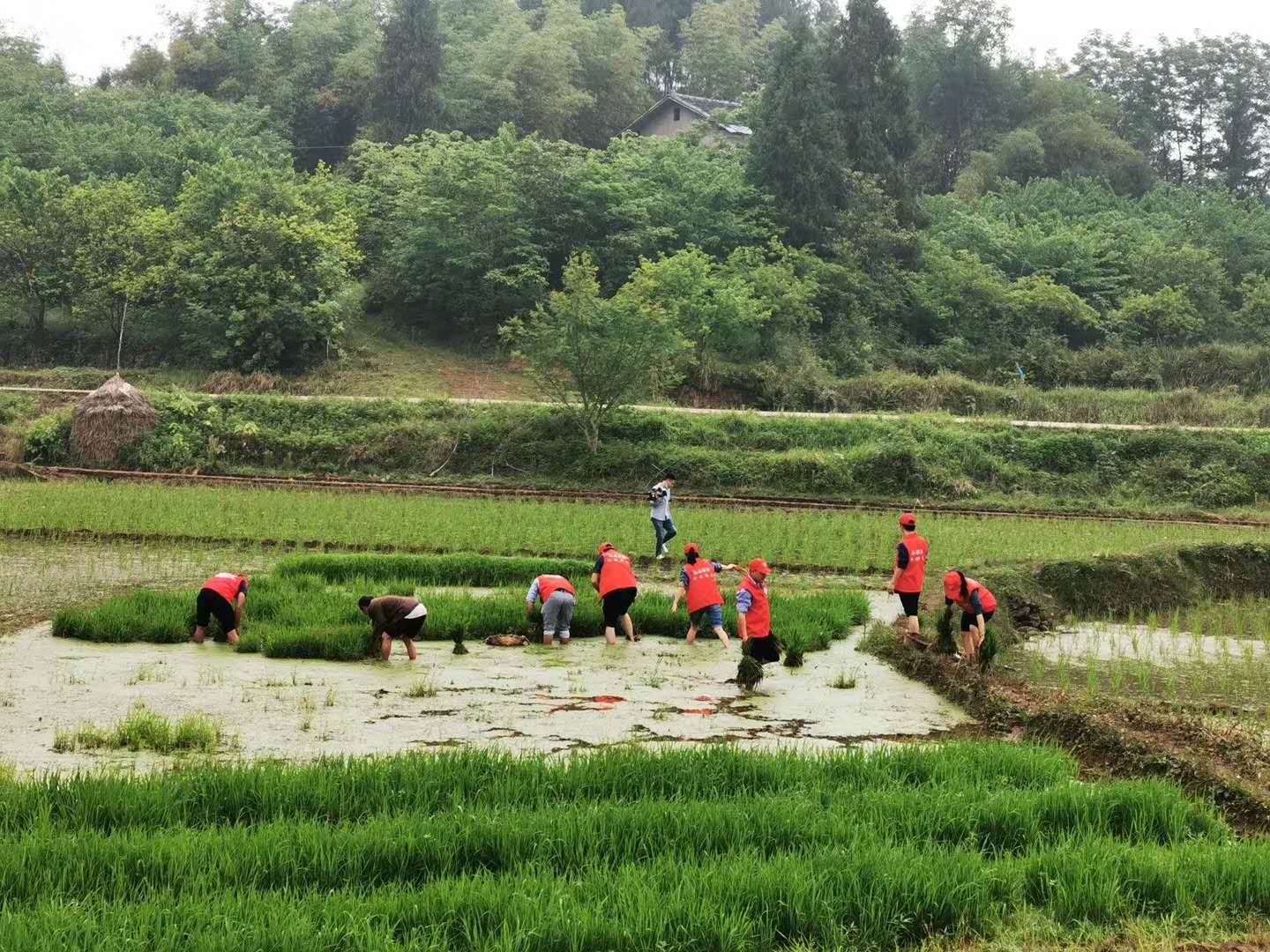 在長(zhǎng)龍鎮(zhèn)政府宣統(tǒng)委員李擁軍、長(zhǎng)龍鎮(zhèn)商會(huì)會(huì)長(zhǎng)趙慶華的帶領(lǐng)下,天氣雖然涼爽,但是志愿者們個(gè)個(gè)熱情高漲,大家既分工有合作,扯秧苗、平水田、插秧……整個(gè)環(huán)節(jié)井然有序。經(jīng)過三個(gè)多小時(shí)的奮戰(zhàn)就完成了高寒元、劉應(yīng)懷兩戶貧困戶3畝水田的插秧。